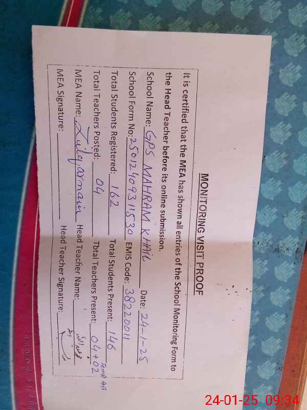 | EMIS Code: 38220011 | Name of School: GPS MAHRAM KHAIL | |||