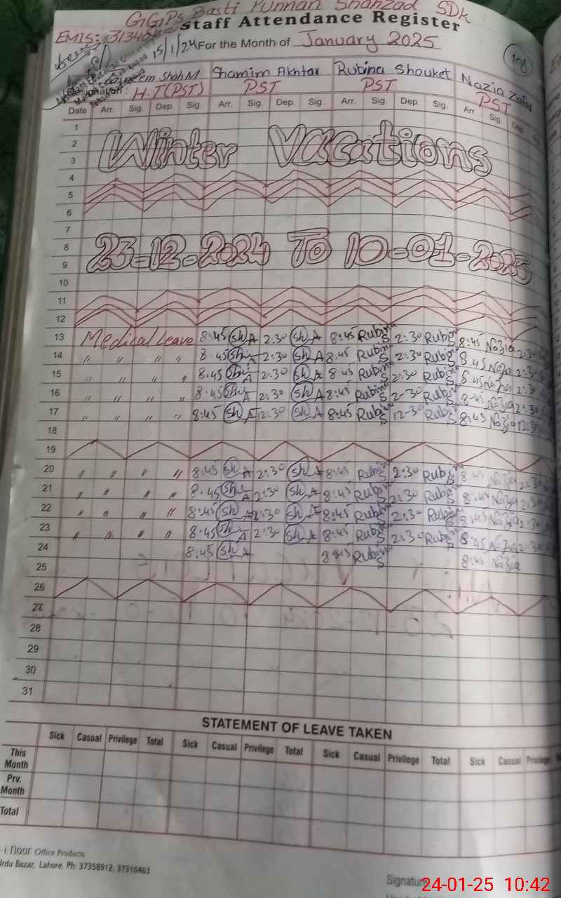 | Remarks (Use Separate Page if Required): Tsnim shsh Muhammad marked absent as her sanctioned leave not produced at the time of inspection | |||||