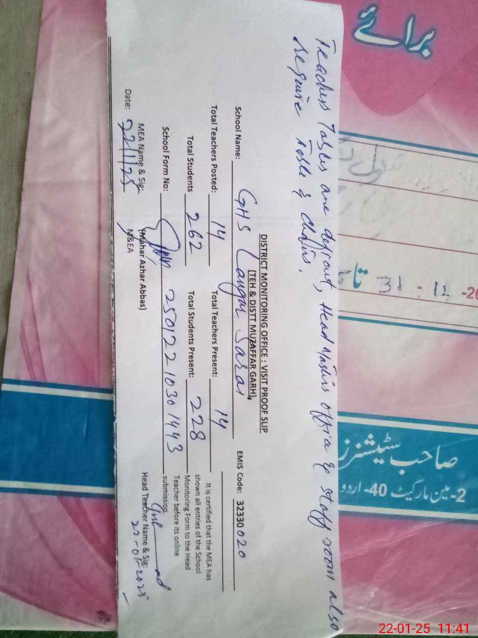 | EMIS Code: 32330020 | Name of School: GHS LANGER SARAI | |||
