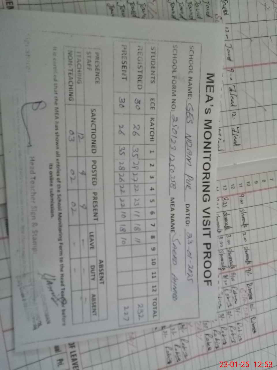 | Attendance Register | Head Teacher | MEA with School | Visit Proof |