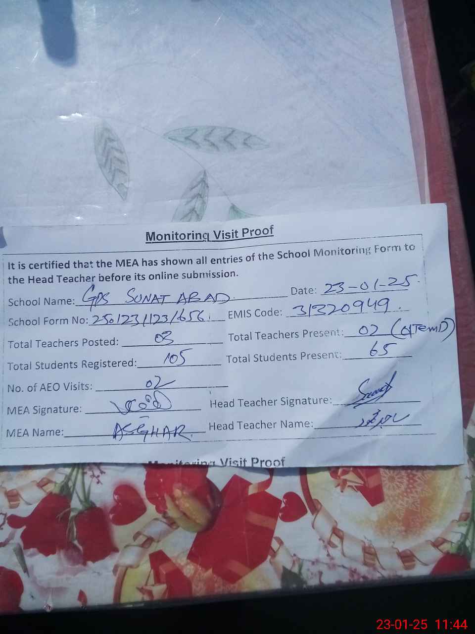 | Attendance Register | Head Teacher | MEA with School | Visit Proof |