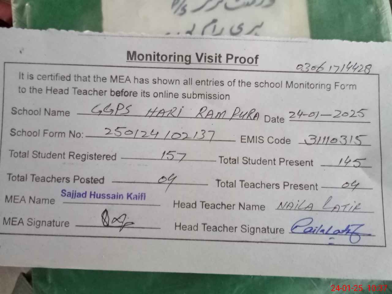 | Attendance Register | Head Teacher | MEA with School | Visit Proof |