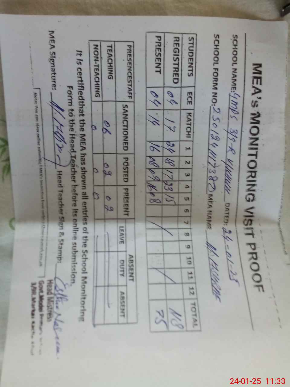 | Attendance Register | Head Teacher | MEA with School | Visit Proof |