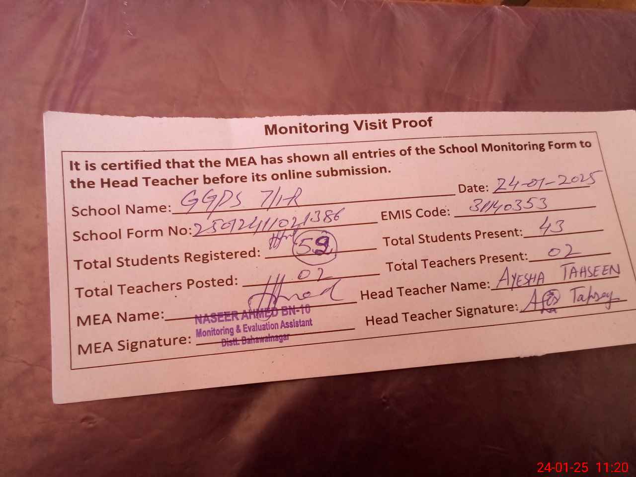 | Attendance Register | Head Teacher | MEA with School | Visit Proof |