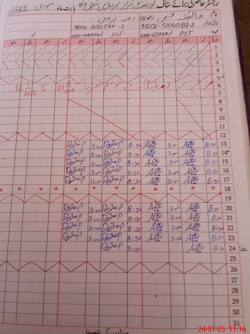 | CNIC | Full Name | Designation | R/C | Absence During Last Calender Month |
