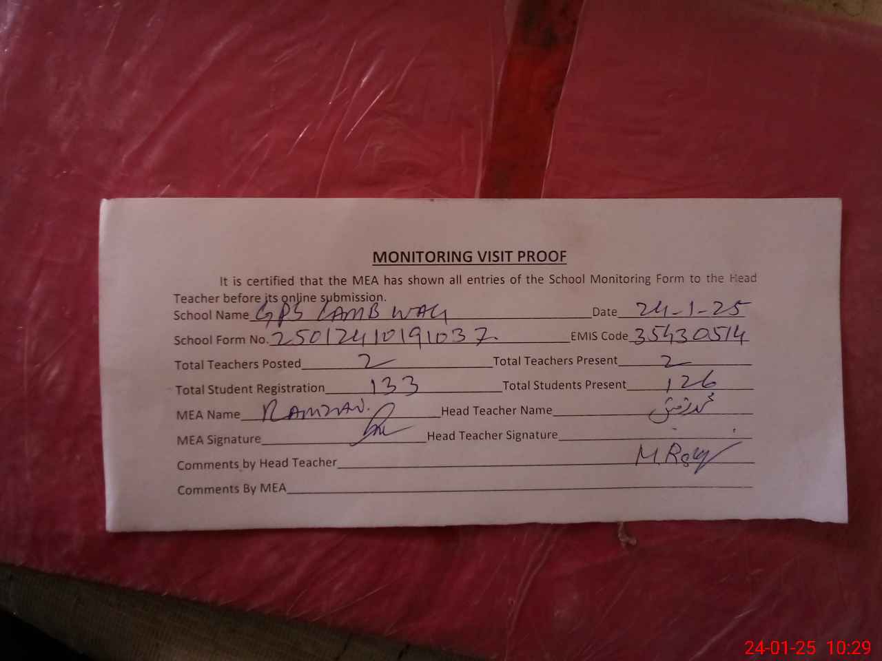 | Attendance Register | Head Teacher | MEA with School | Visit Proof |