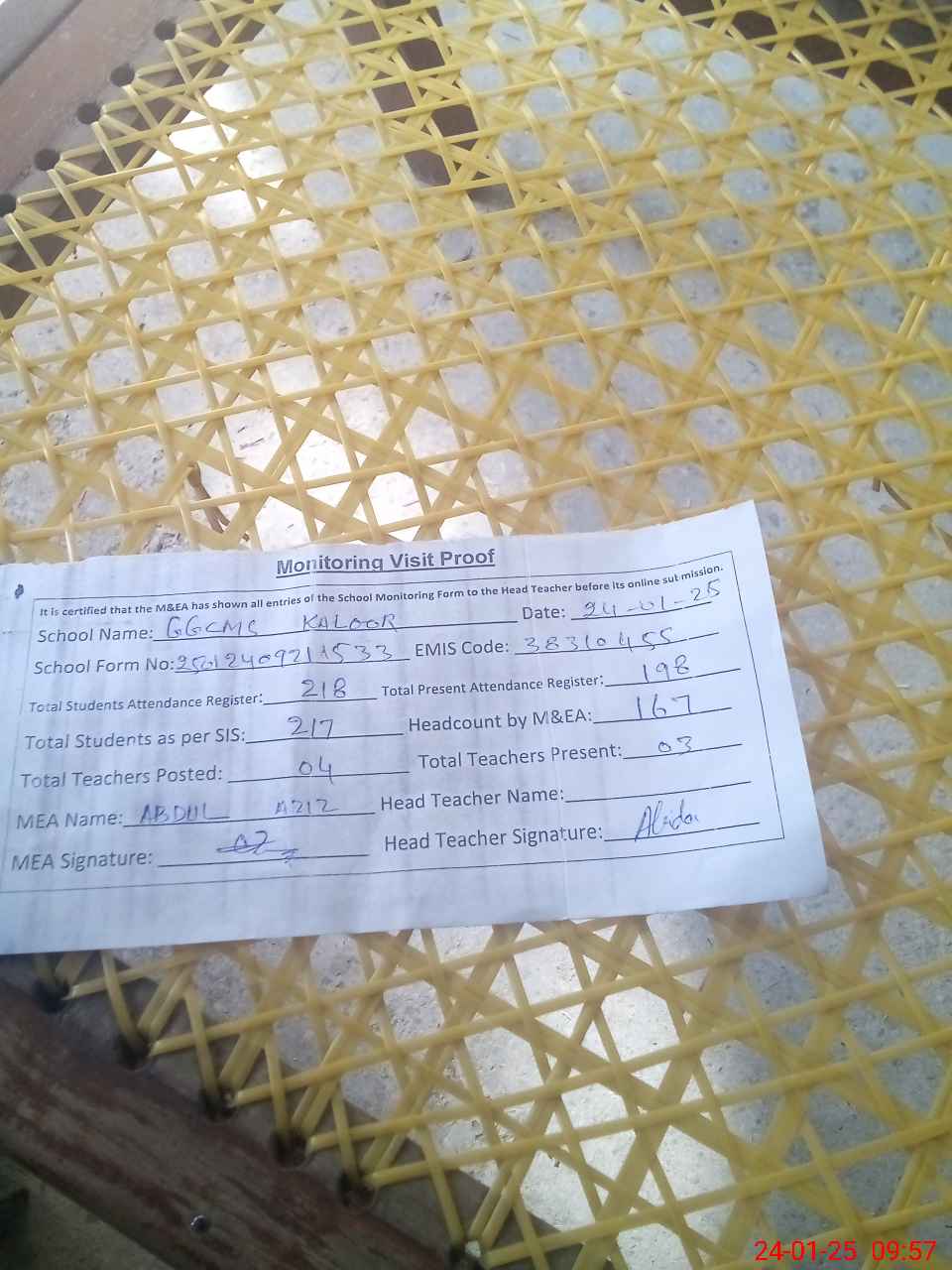 | Attendance Register | Head Teacher | MEA with School | Visit Proof |