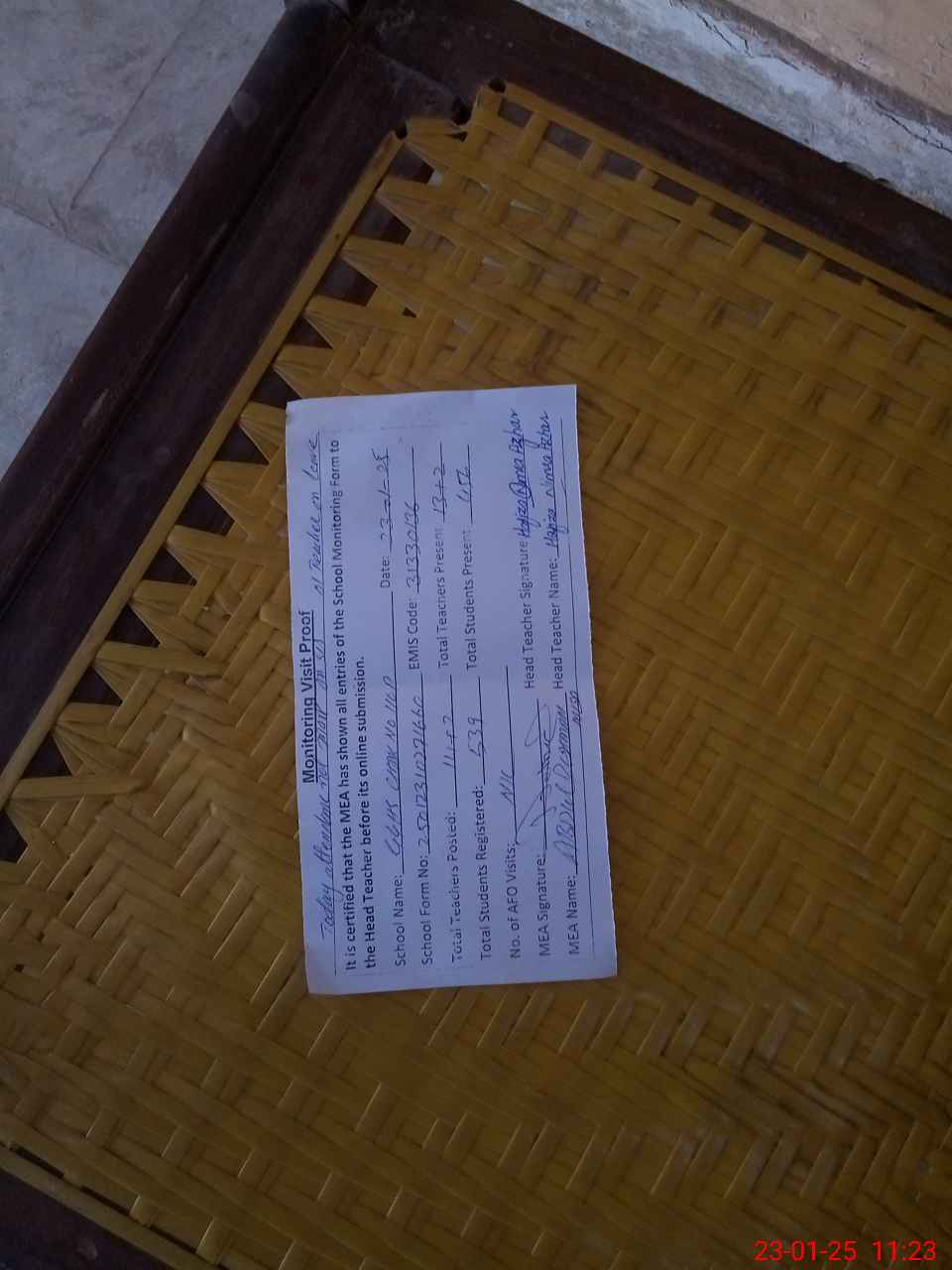 | Attendance Register | Head Teacher | MEA with School | Visit Proof |