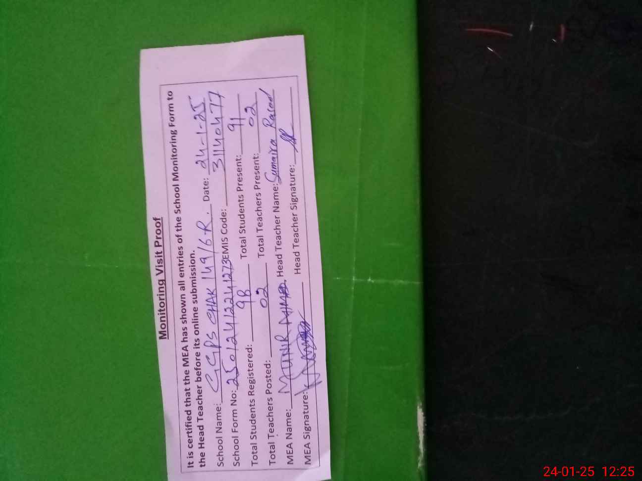 | Attendance Register | Head Teacher | MEA with School | Visit Proof |