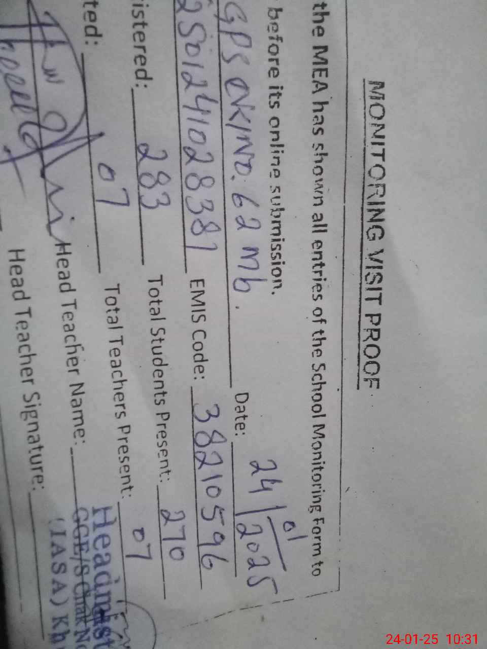 | Attendance Register | Head Teacher | MEA with School | Visit Proof |