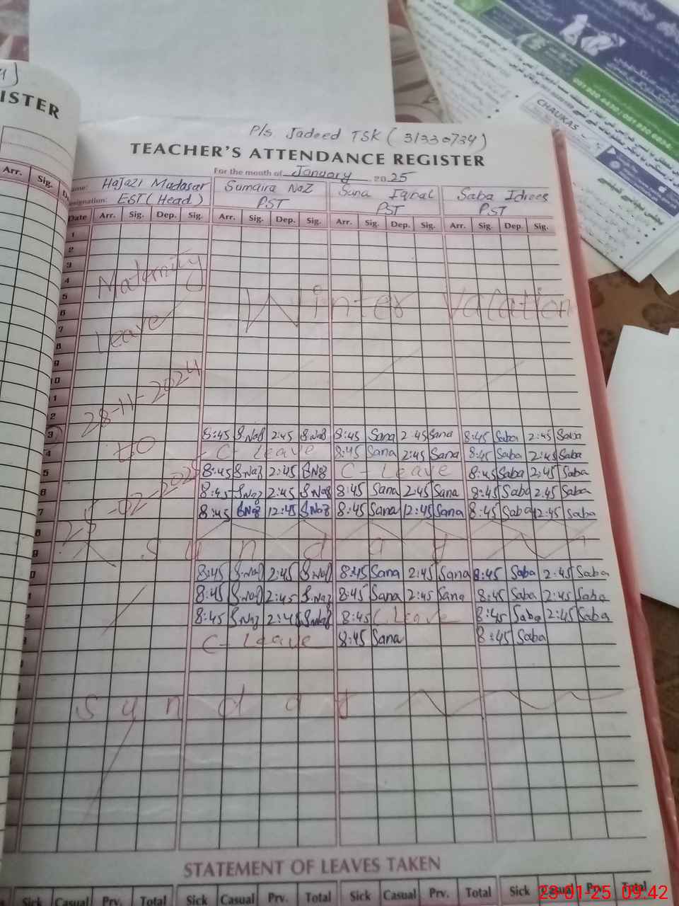| Leave | Duty | Absent | Maternity | Medical | Ex- Pak |