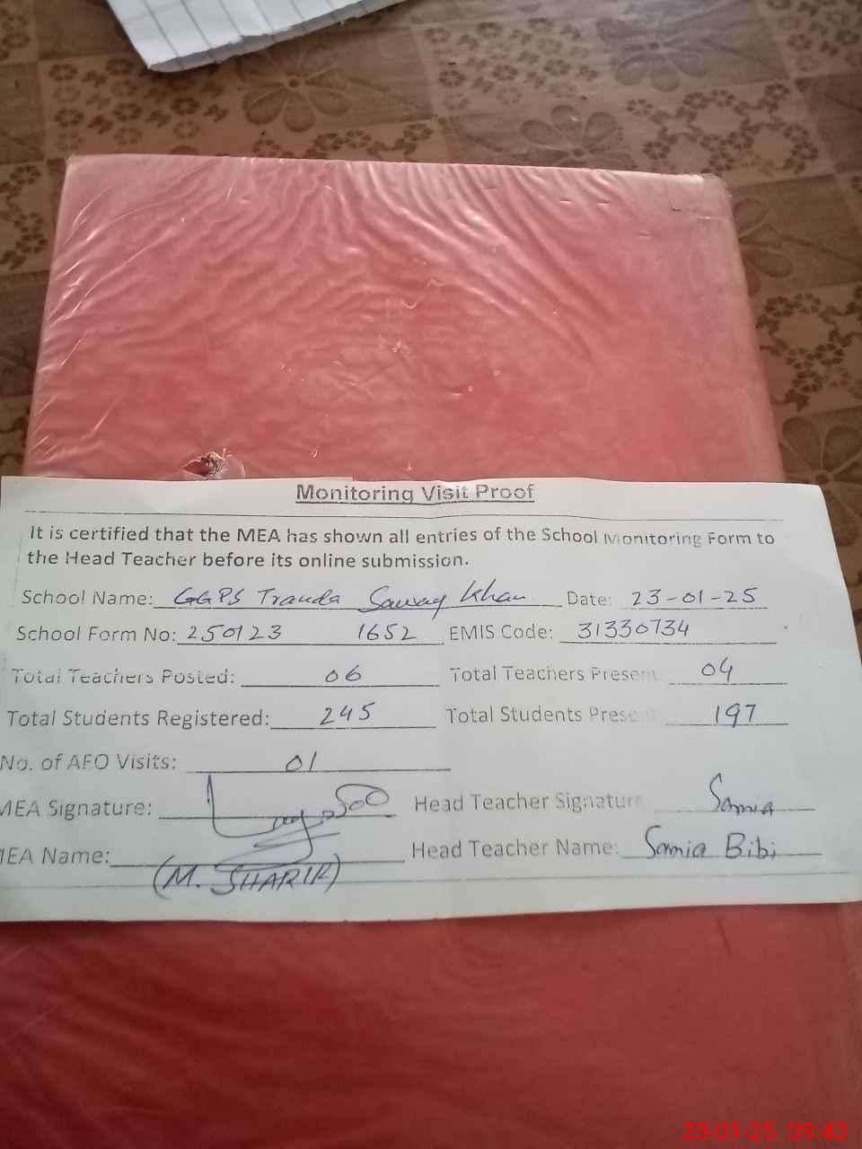 | Attendance Register | Head Teacher | MEA with School | Visit Proof |