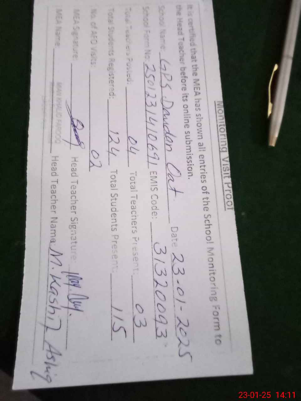 | Attendance Register | Head Teacher | MEA with School | Visit Proof |