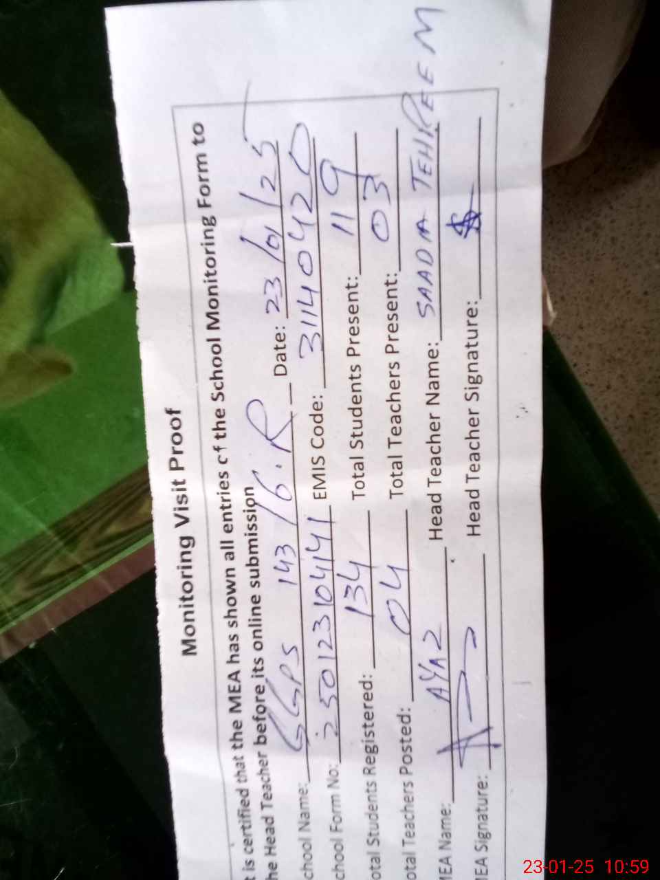 | Attendance Register | Head Teacher | MEA with School | Visit Proof |