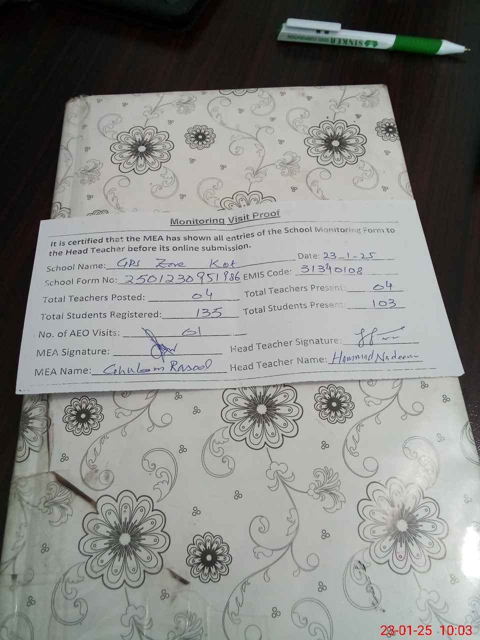 | Attendance Register | Head Teacher | MEA with School | Visit Proof |