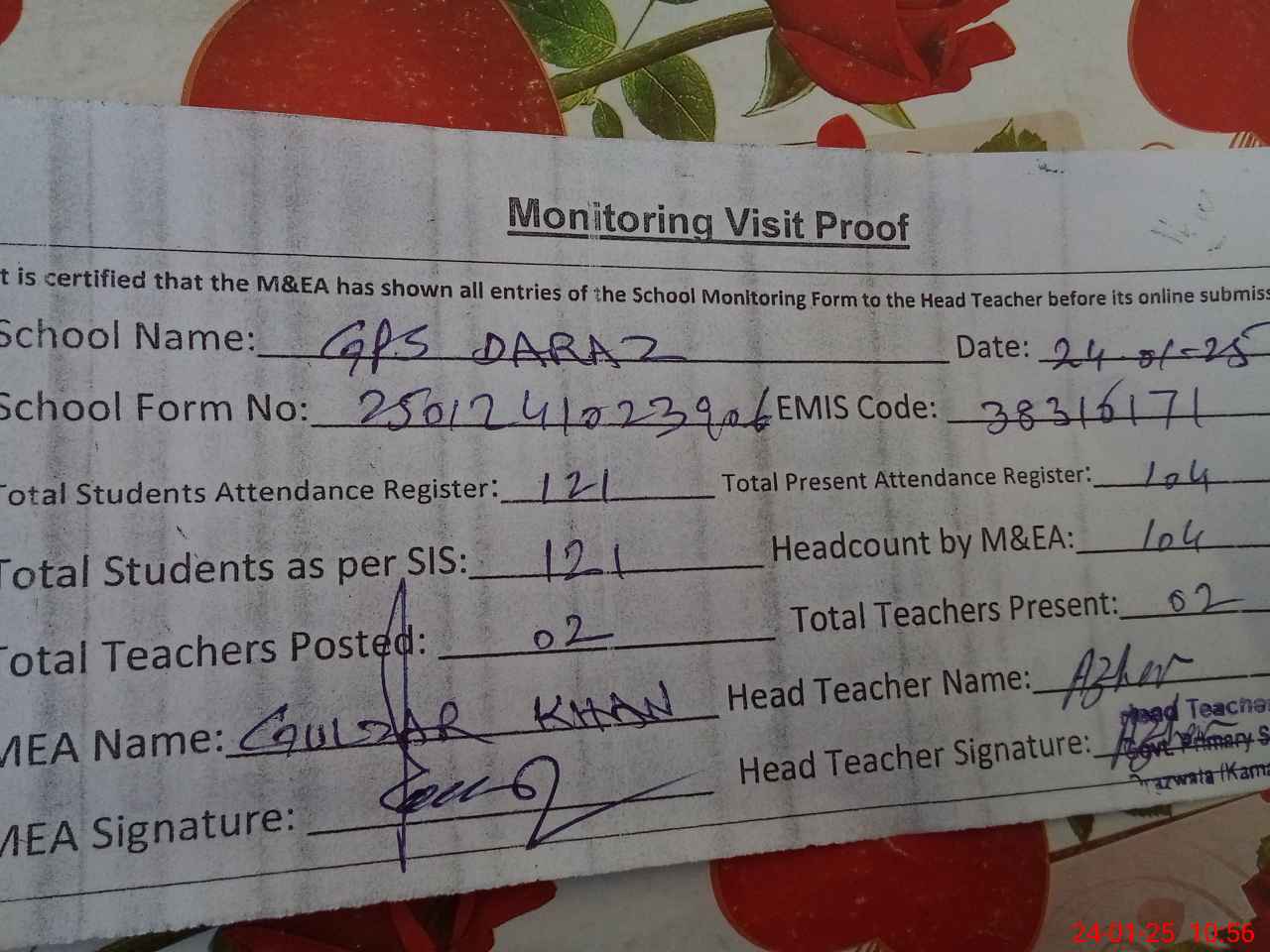 | Attendance Register | Head Teacher | MEA with School | Visit Proof |