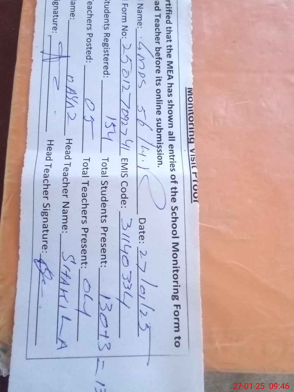 | Attendance Register | Head Teacher | MEA with School | Visit Proof |