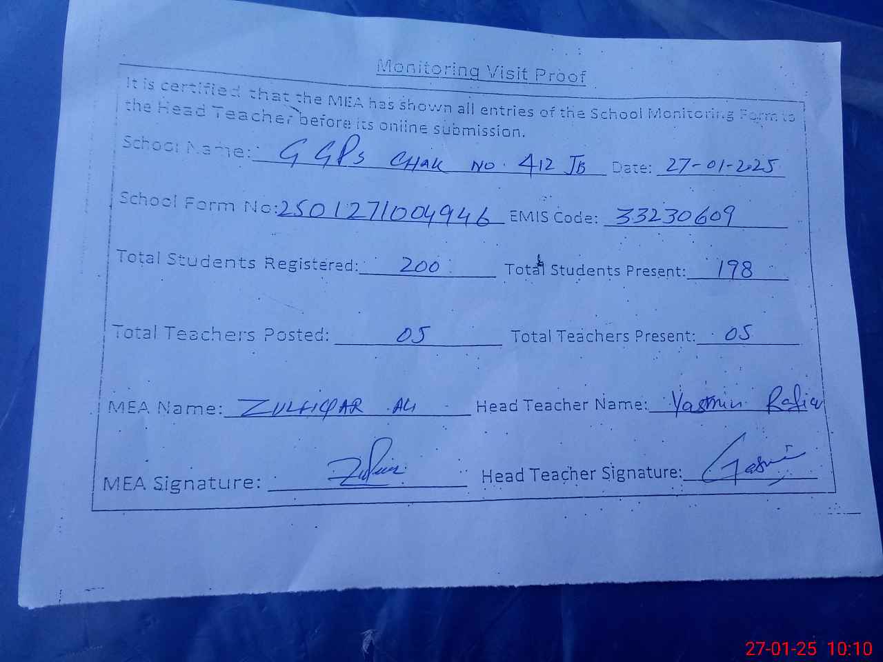 | Attendance Register | Head Teacher | MEA with School | Visit Proof |