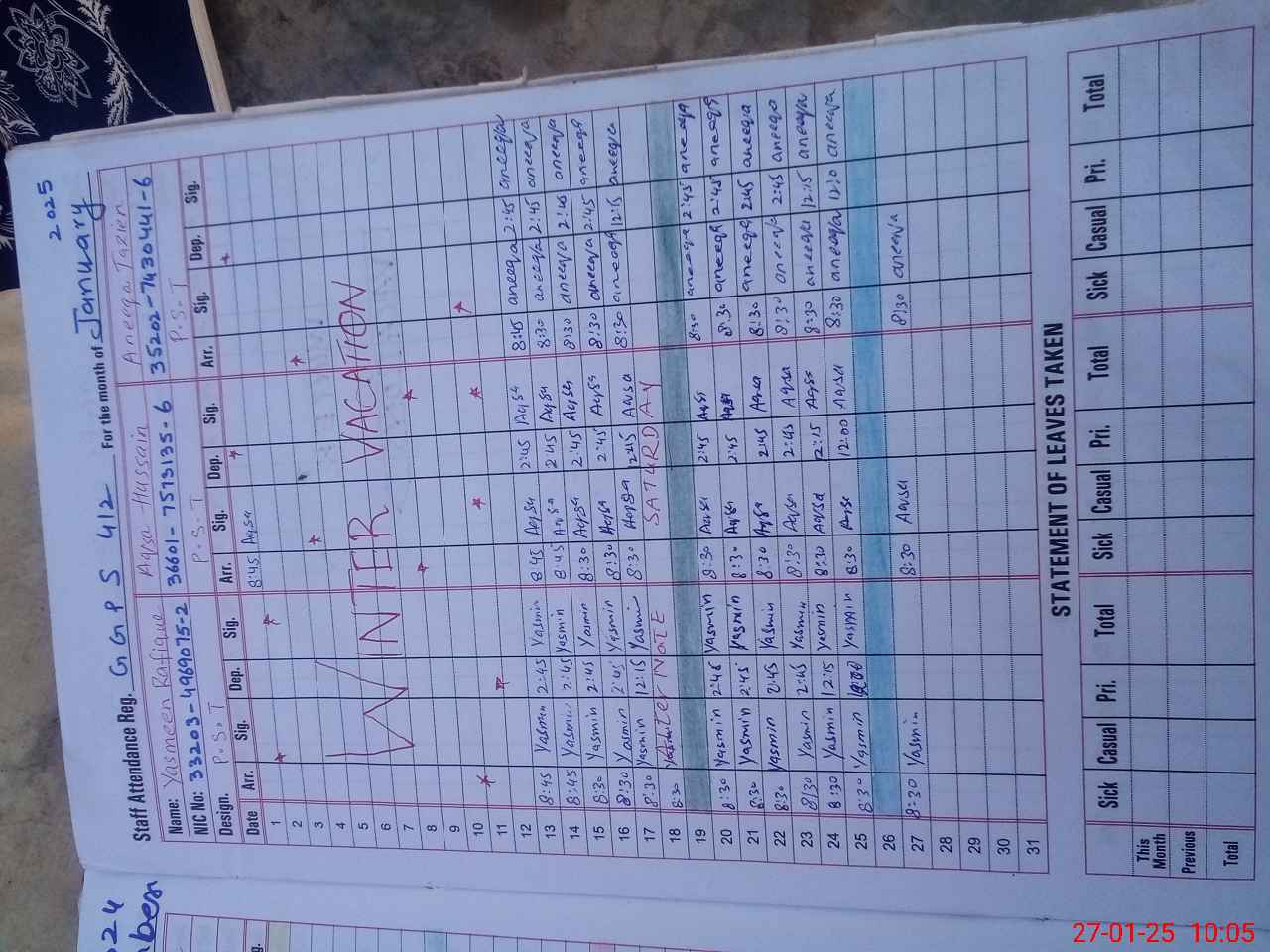 | CNIC | Full Name | Designation | R/C | Absence During Last Calender Month |