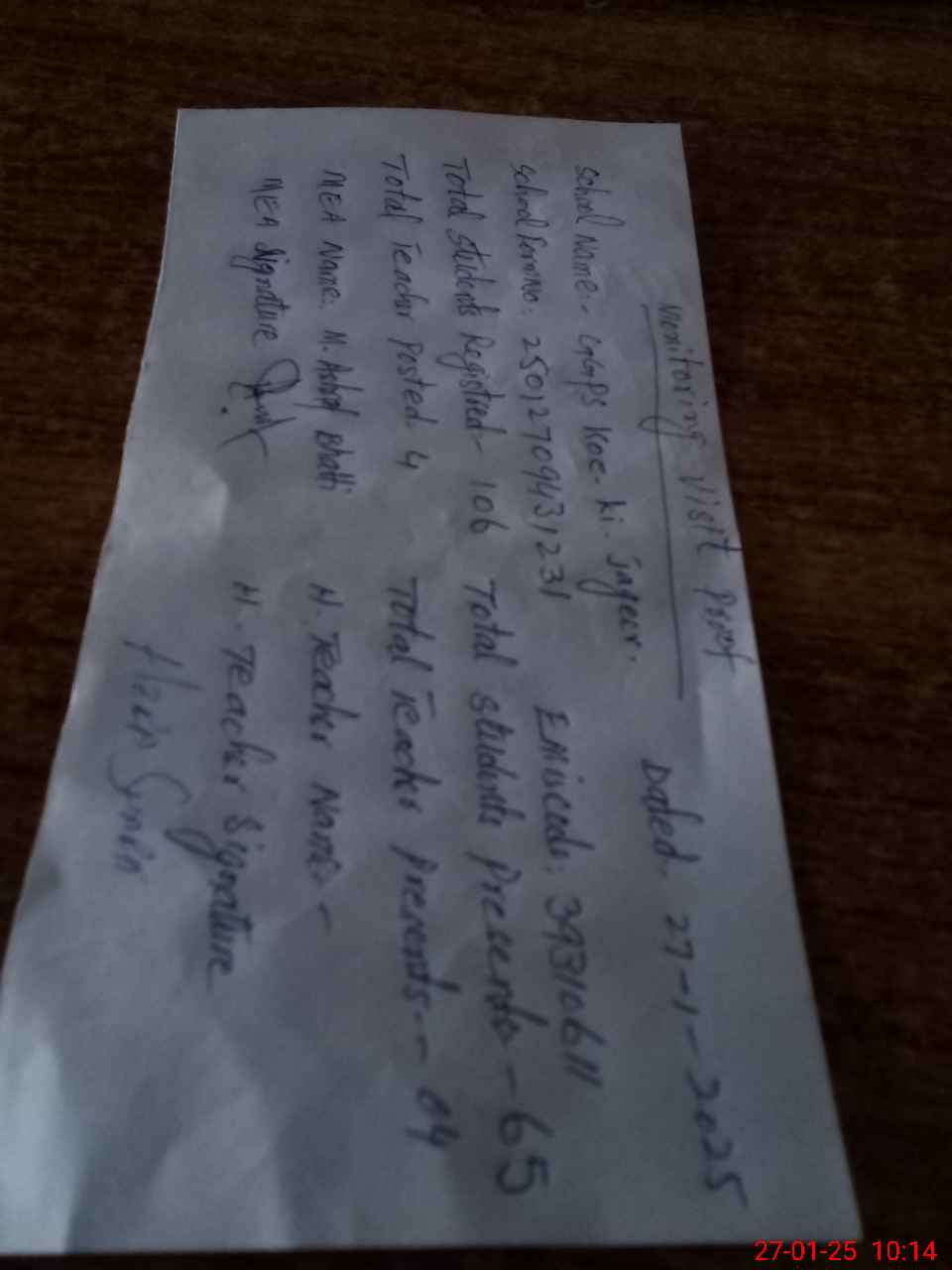 | Attendance Register | Head Teacher | MEA with School | Visit Proof |