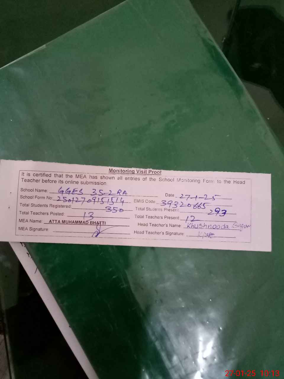 | Attendance Register | Head Teacher | MEA with School | Visit Proof |