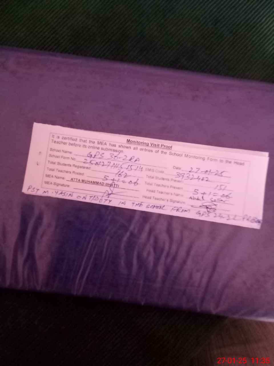 | Attendance Register | Head Teacher | MEA with School | Visit Proof |