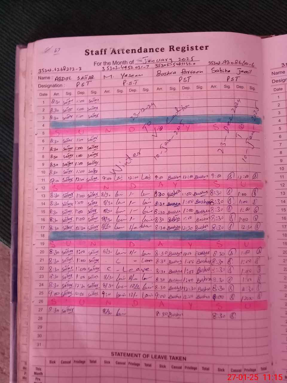 | CNIC | Full Name | Designation | R/C | Absence During Last Calender Month |