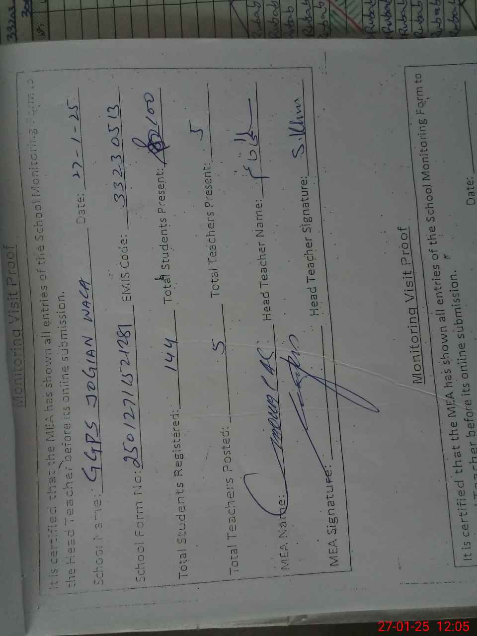 | Attendance Register | Head Teacher | MEA with School | Visit Proof |