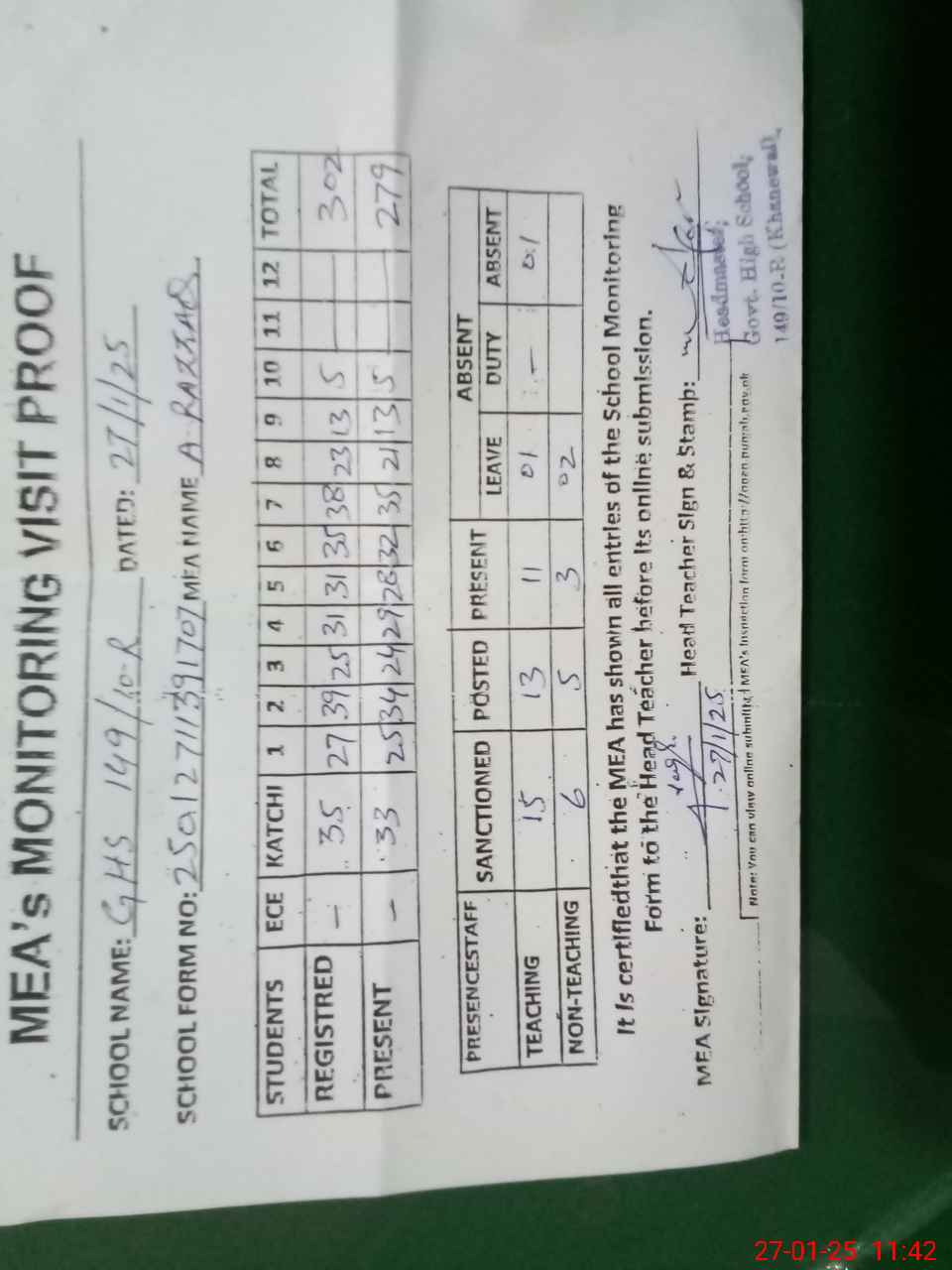 | Attendance Register | Head Teacher | MEA with School | Visit Proof |