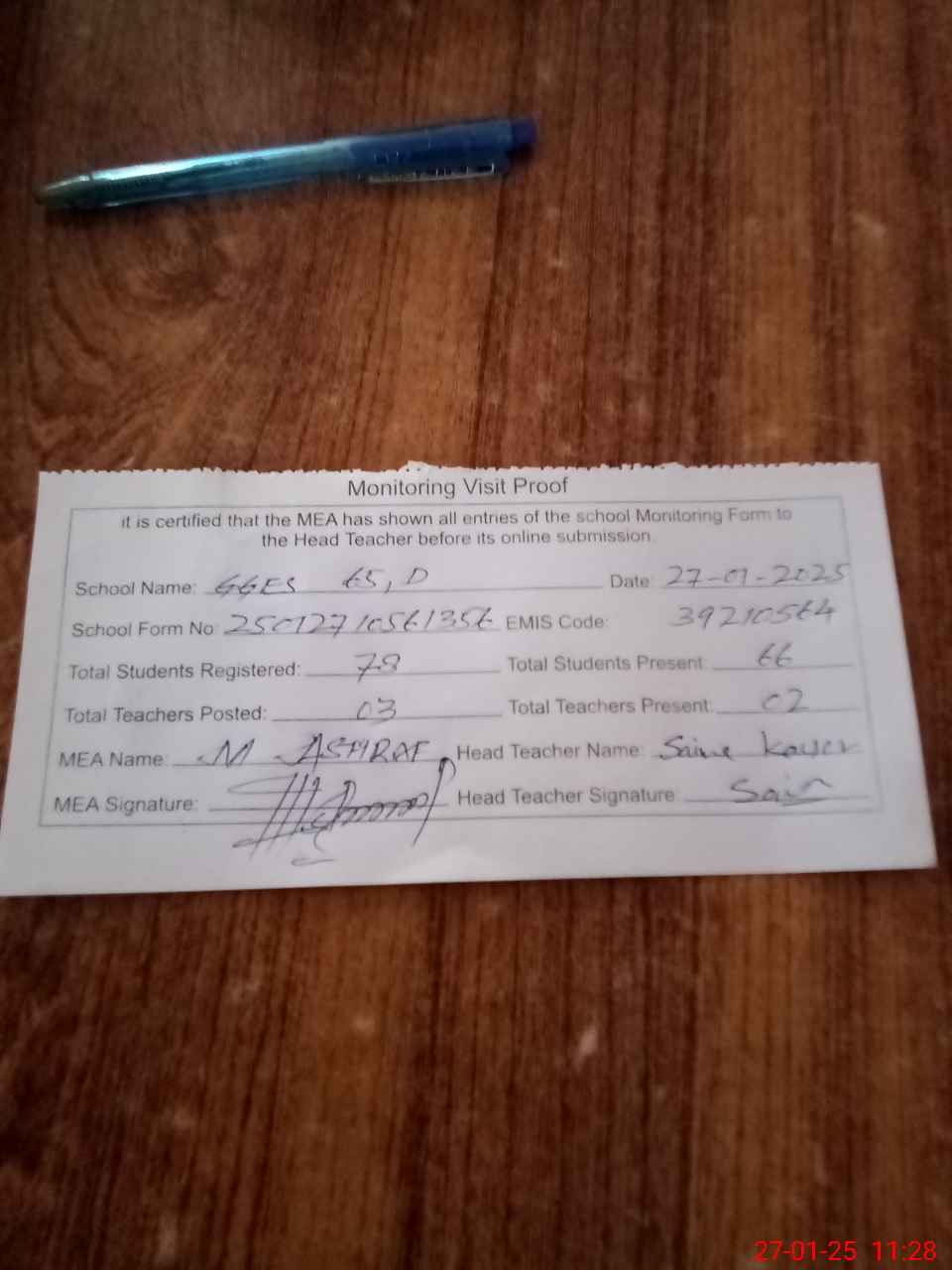 | Attendance Register | Head Teacher | MEA with School | Visit Proof |