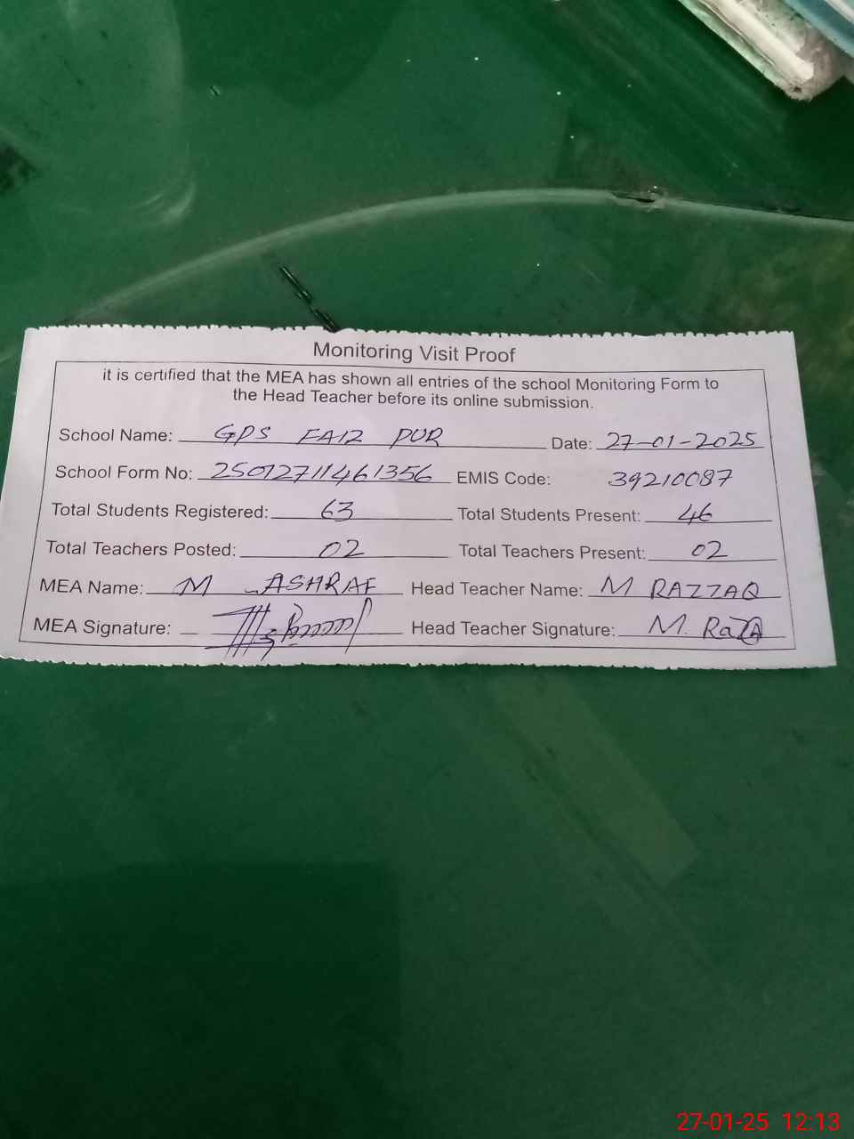 | Attendance Register | Head Teacher | MEA with School | Visit Proof |