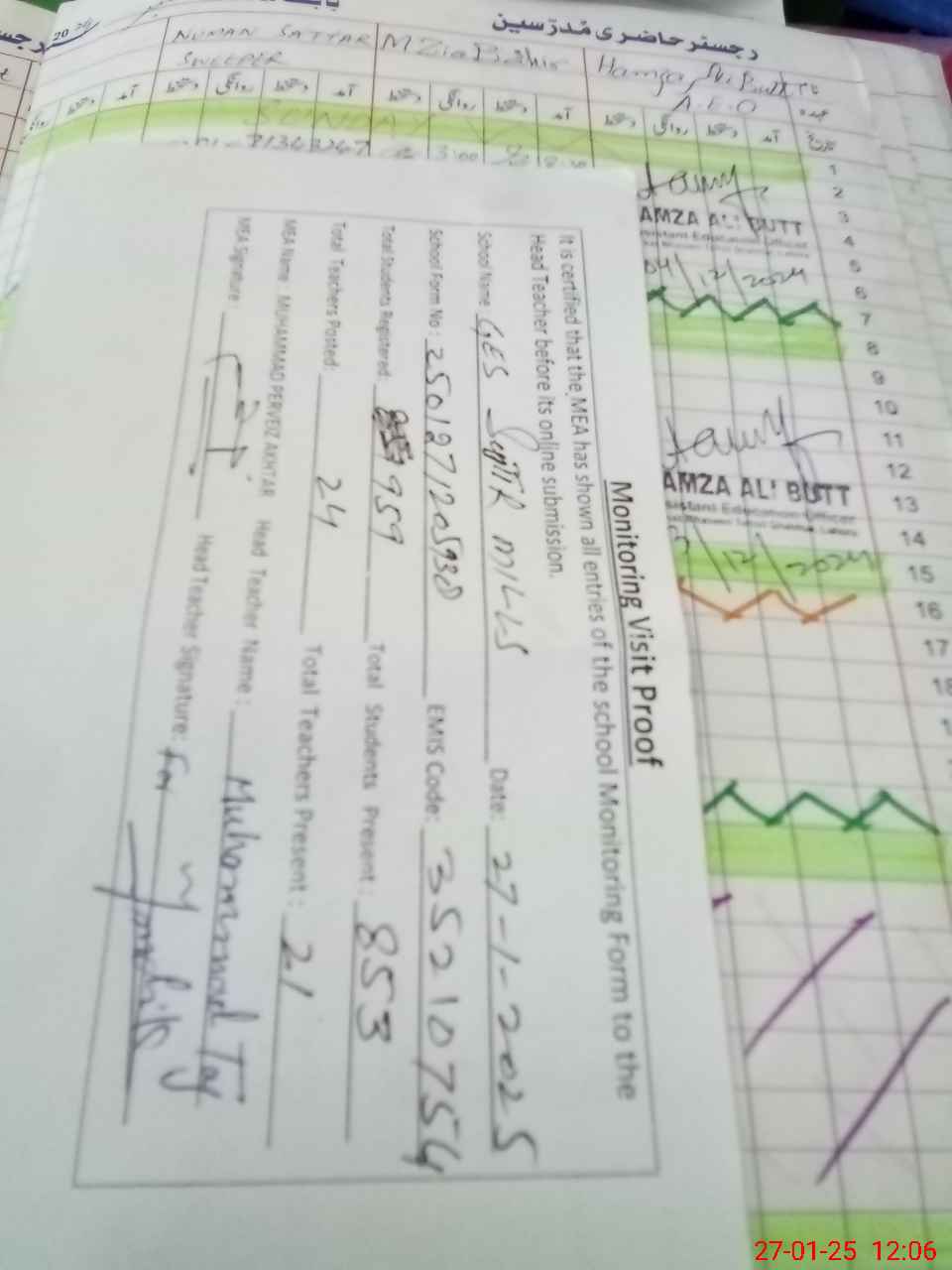| Attendance Register | Head Teacher | MEA with School | Visit Proof |