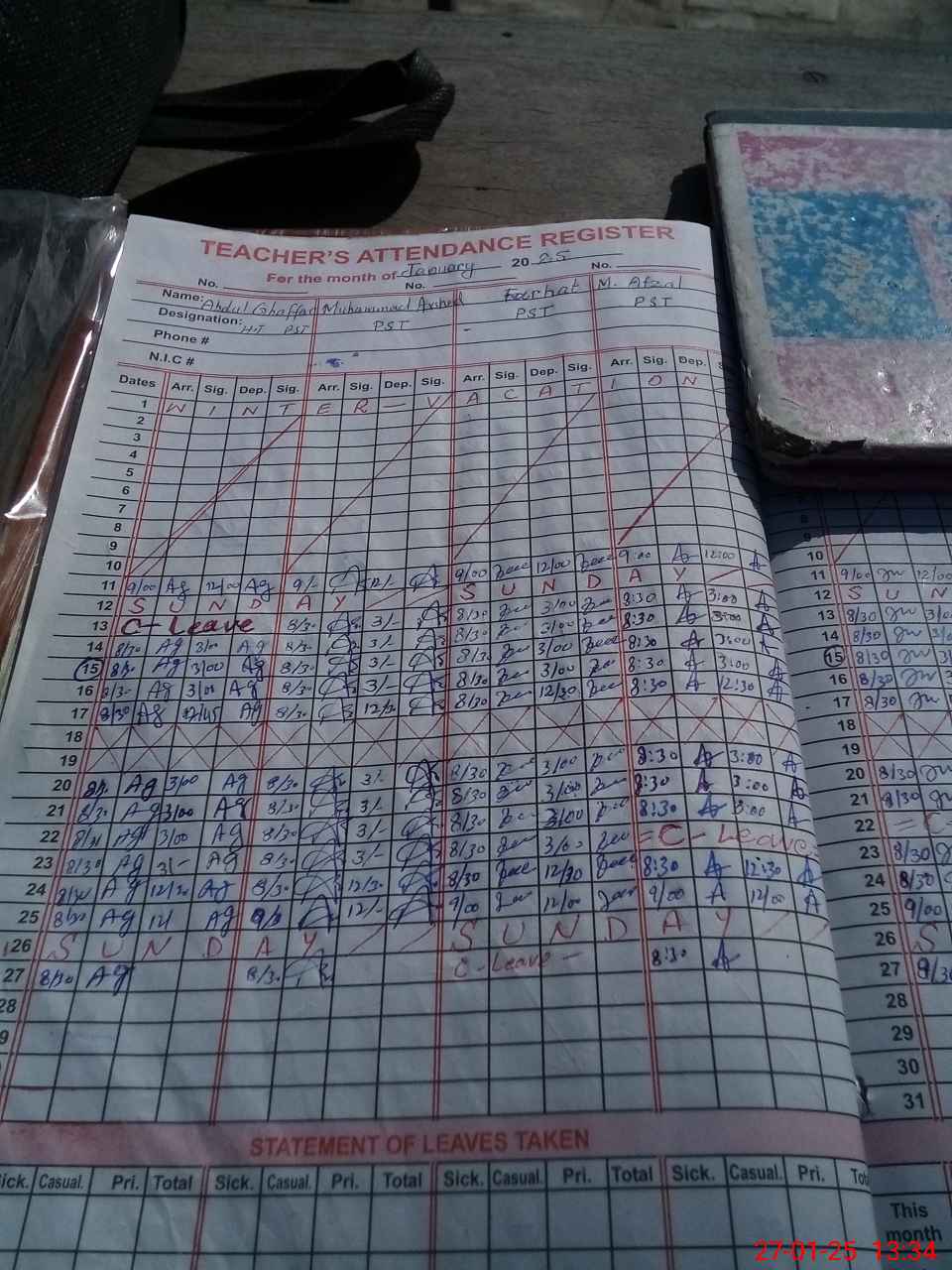 | CNIC | Full Name | Designation | R/C | Absence During Last Calender Month |