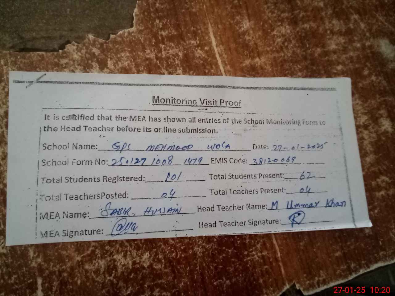 | Attendance Register | Head Teacher | MEA with School | Visit Proof |