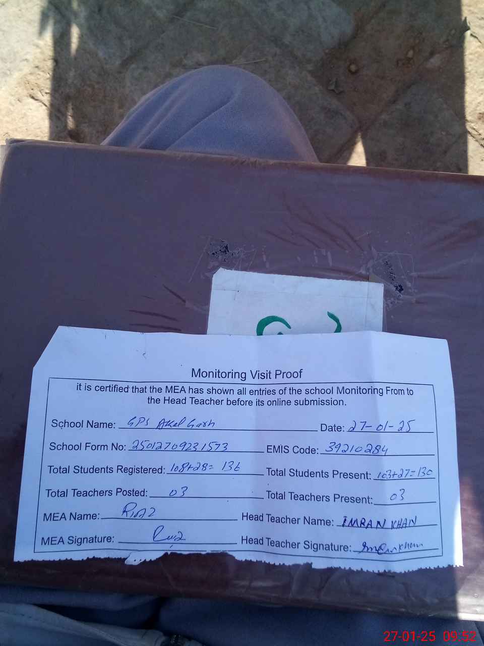 | Attendance Register | Head Teacher | MEA with School | Visit Proof |