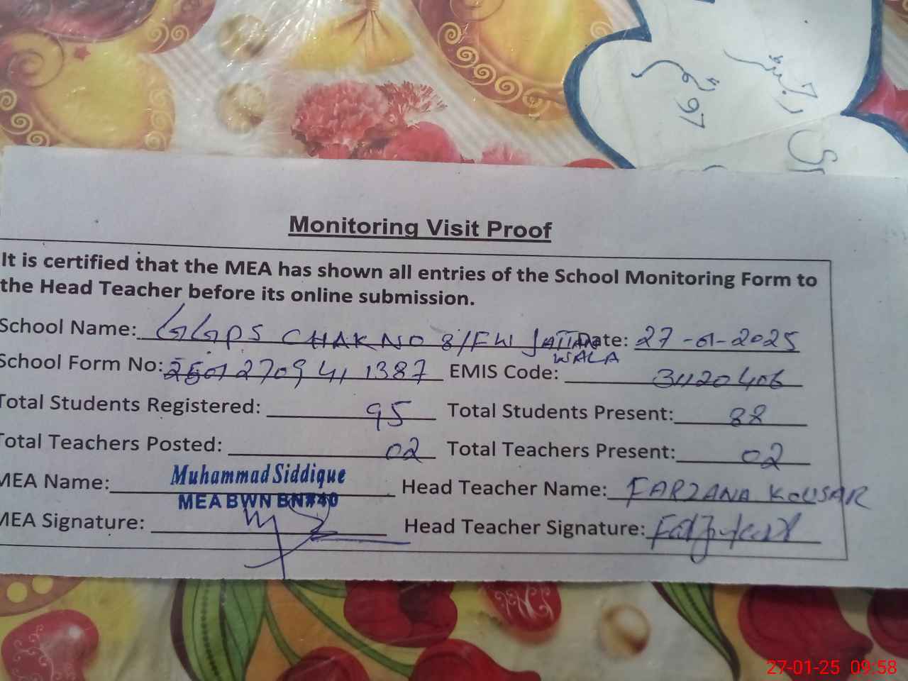 | Attendance Register | Head Teacher | MEA with School | Visit Proof |