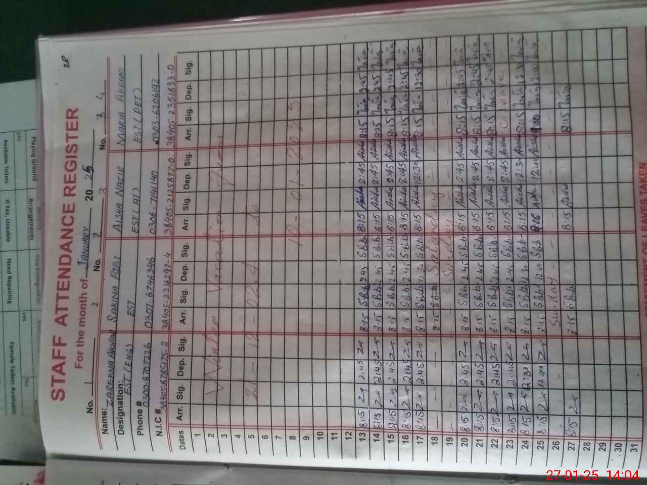 | CNIC | Full Name | Designation | R/C | Absence during last cal. month |