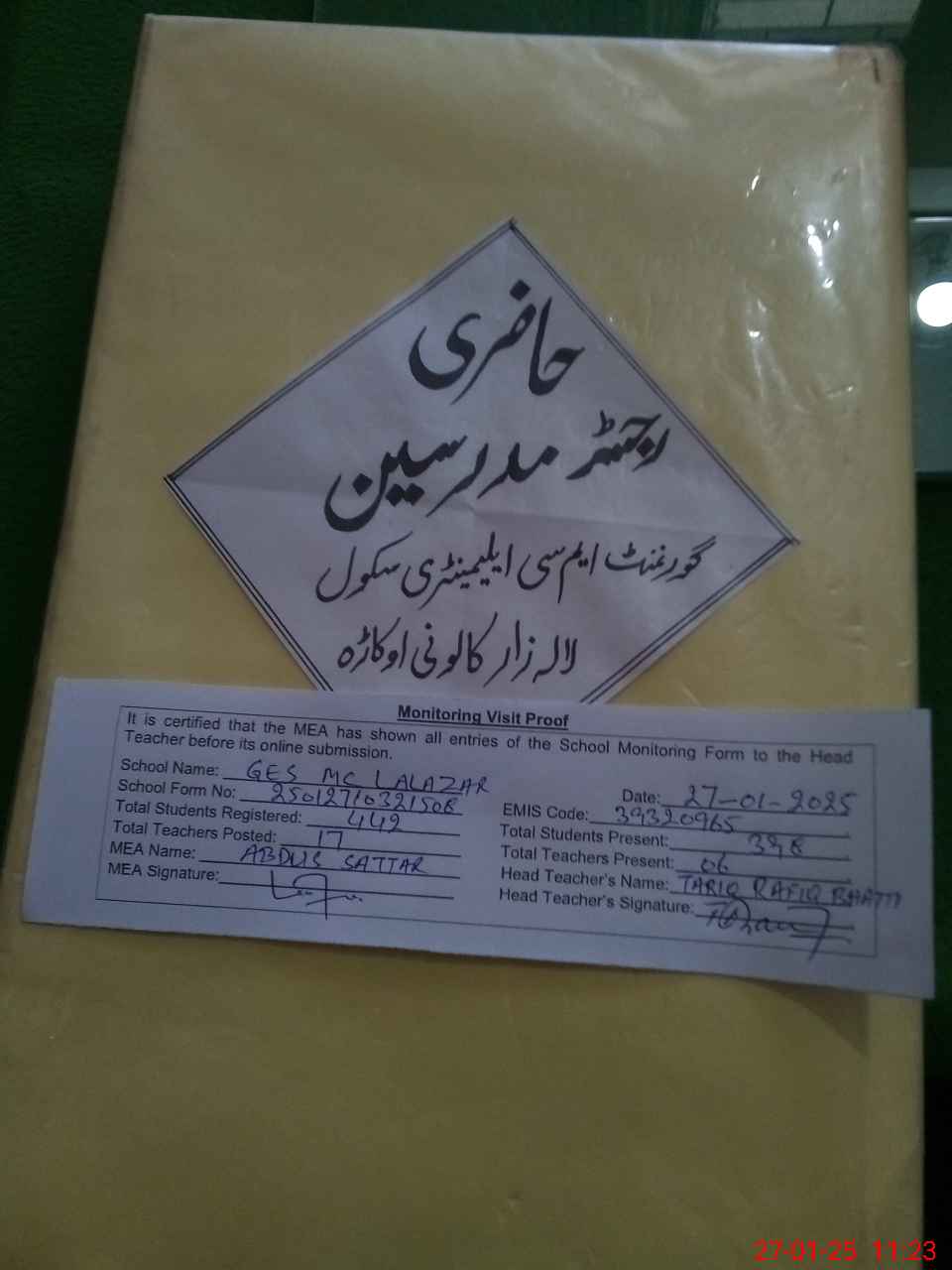 | Attendance Register | Head Teacher | MEA with School | Visit Proof |