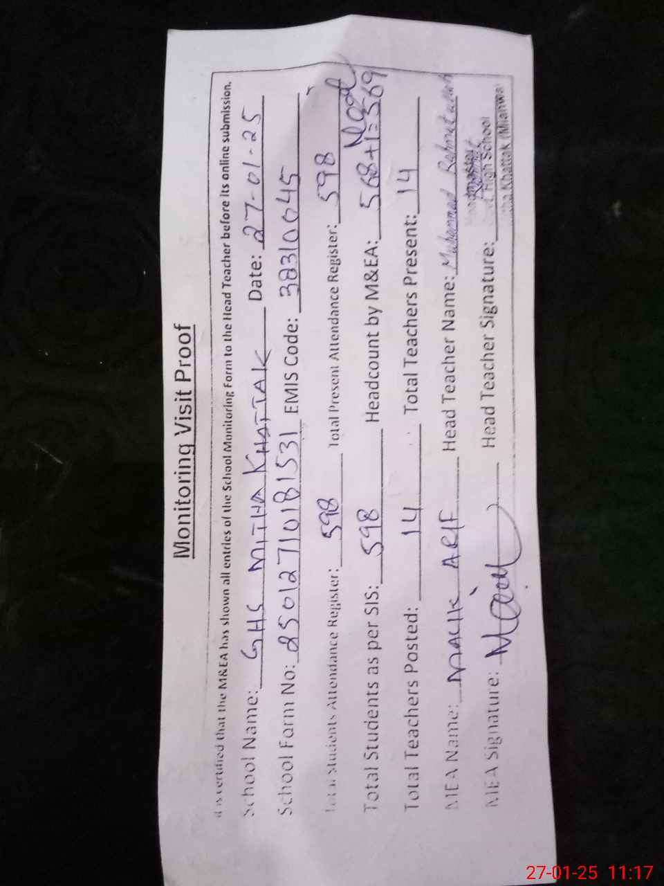 | Attendance Register | Head Teacher | MEA with School | Visit Proof |