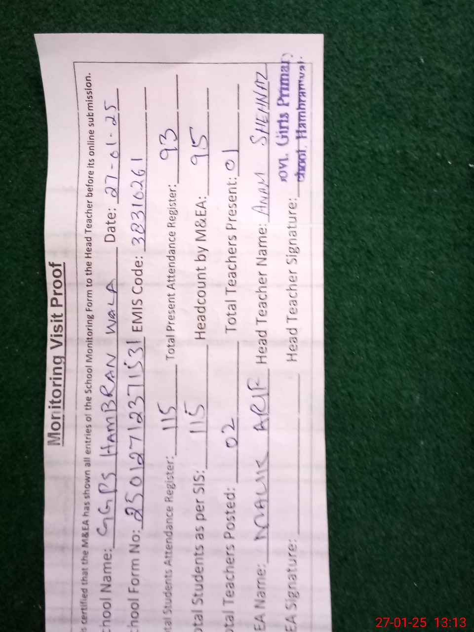 | Attendance Register | Head Teacher | MEA with School | Visit Proof |
