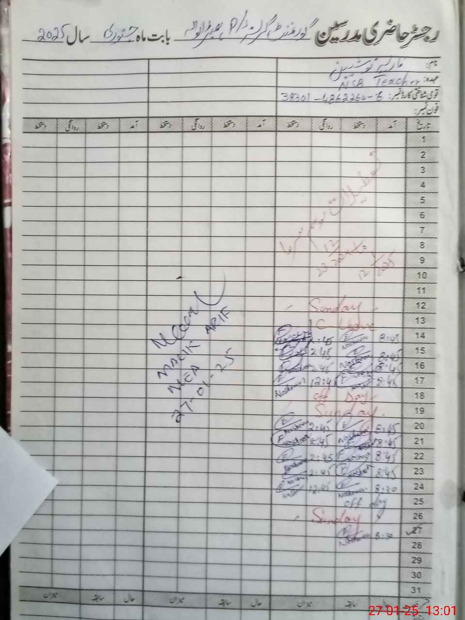 | CNIC | Full Name | Designation | R/C | Absence During Last Calender Month |