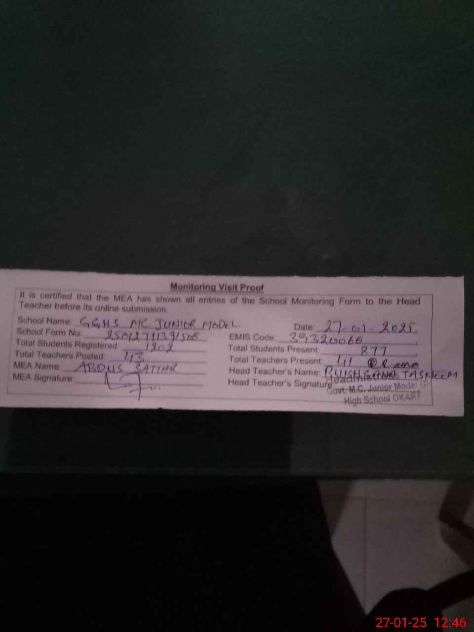 | EMIS Code: 39320068 | Name of School: GGHS MC JUNIOR MODEL OKARA | |||