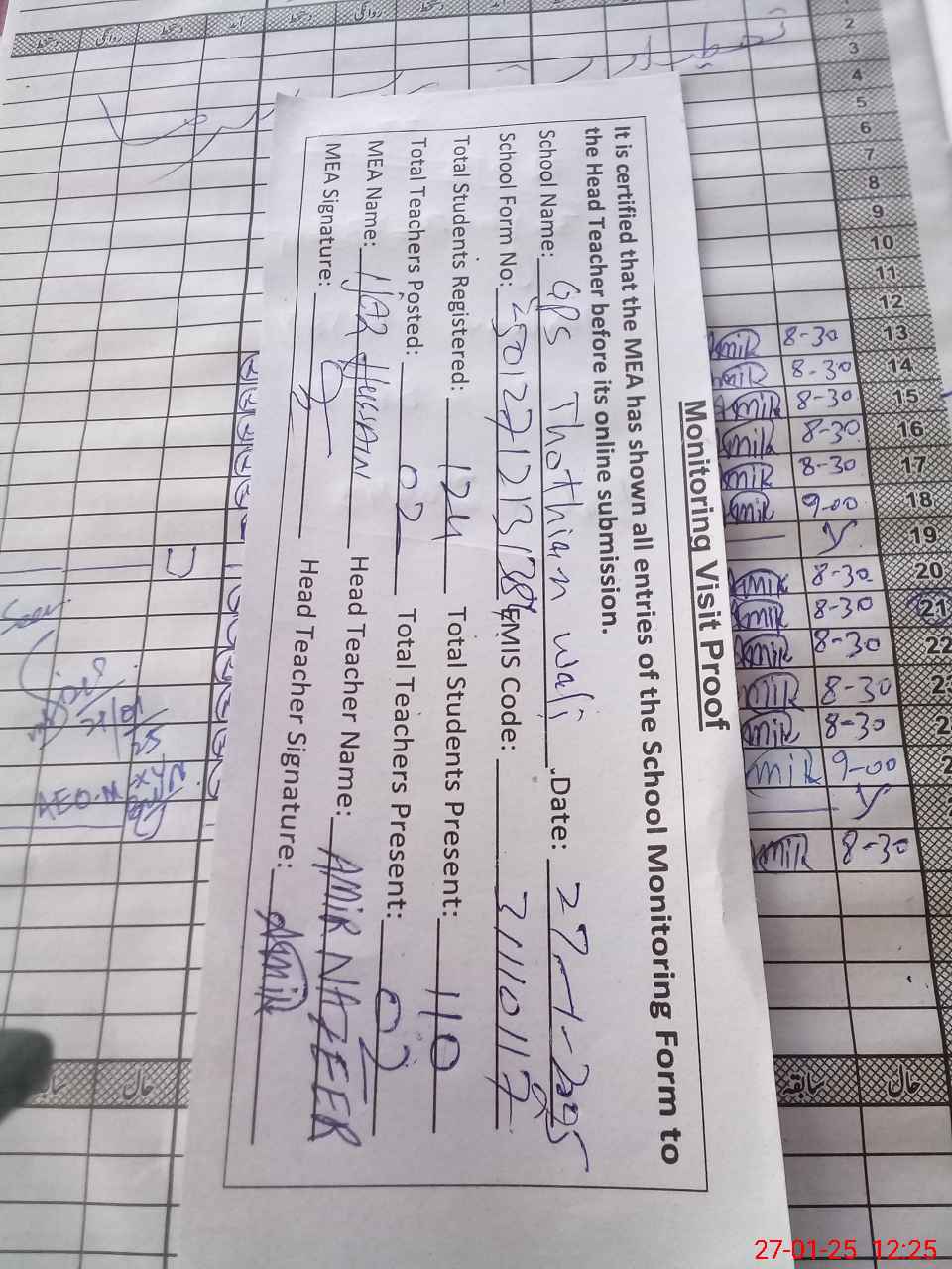 | Attendance Register | Head Teacher | MEA with School | Visit Proof |