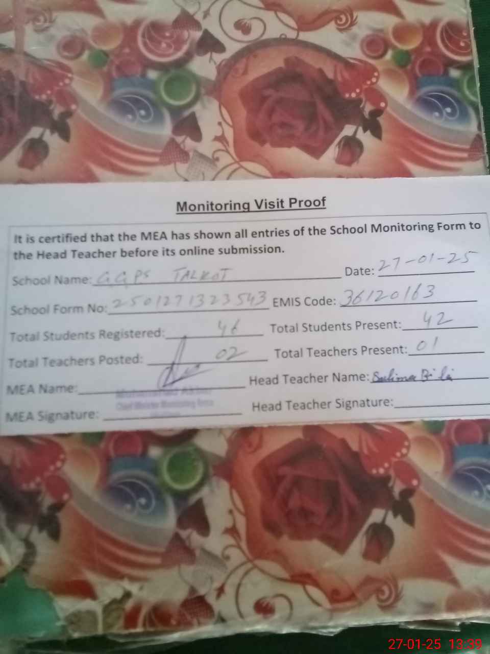 | Attendance Register | Head Teacher | MEA with School | Visit Proof |