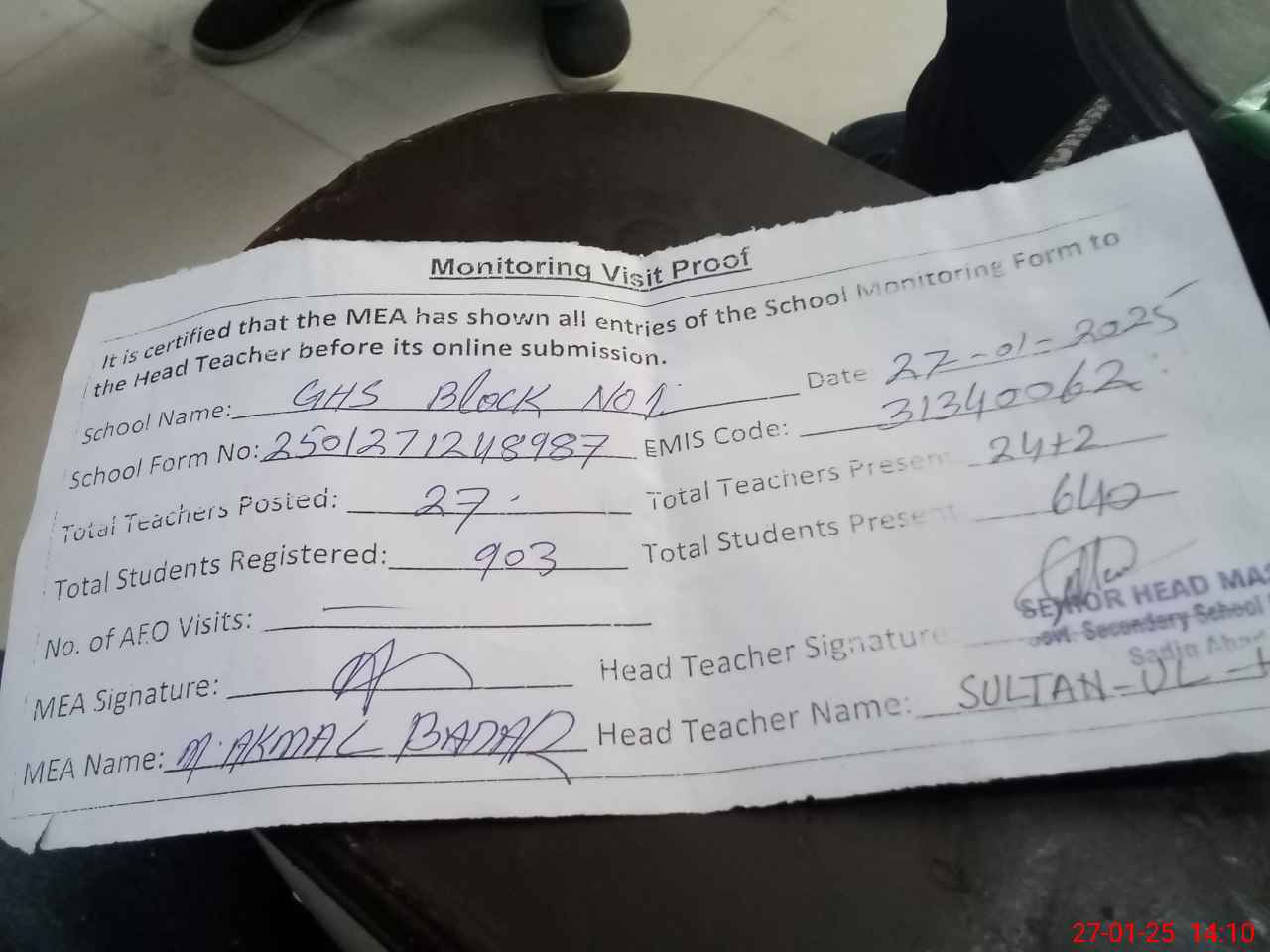 | Attendance Register | Head Teacher | MEA with School | Visit Proof |