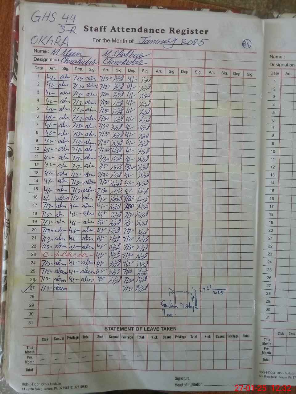 | CNIC | Full Name | Designation | R/C | Absence During Last Calender Month |
