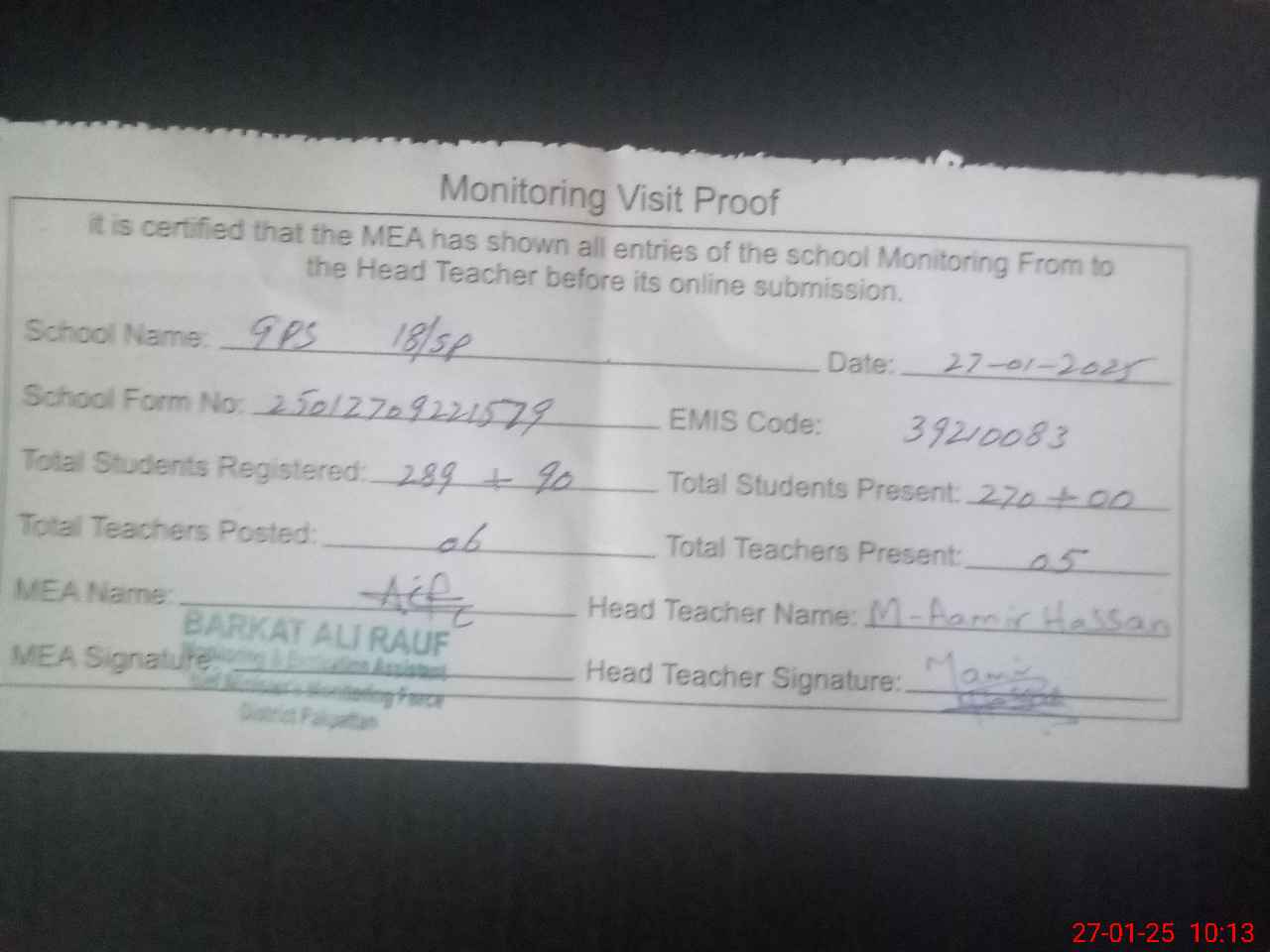 | Attendance Register | Head Teacher | MEA with School | Visit Proof |