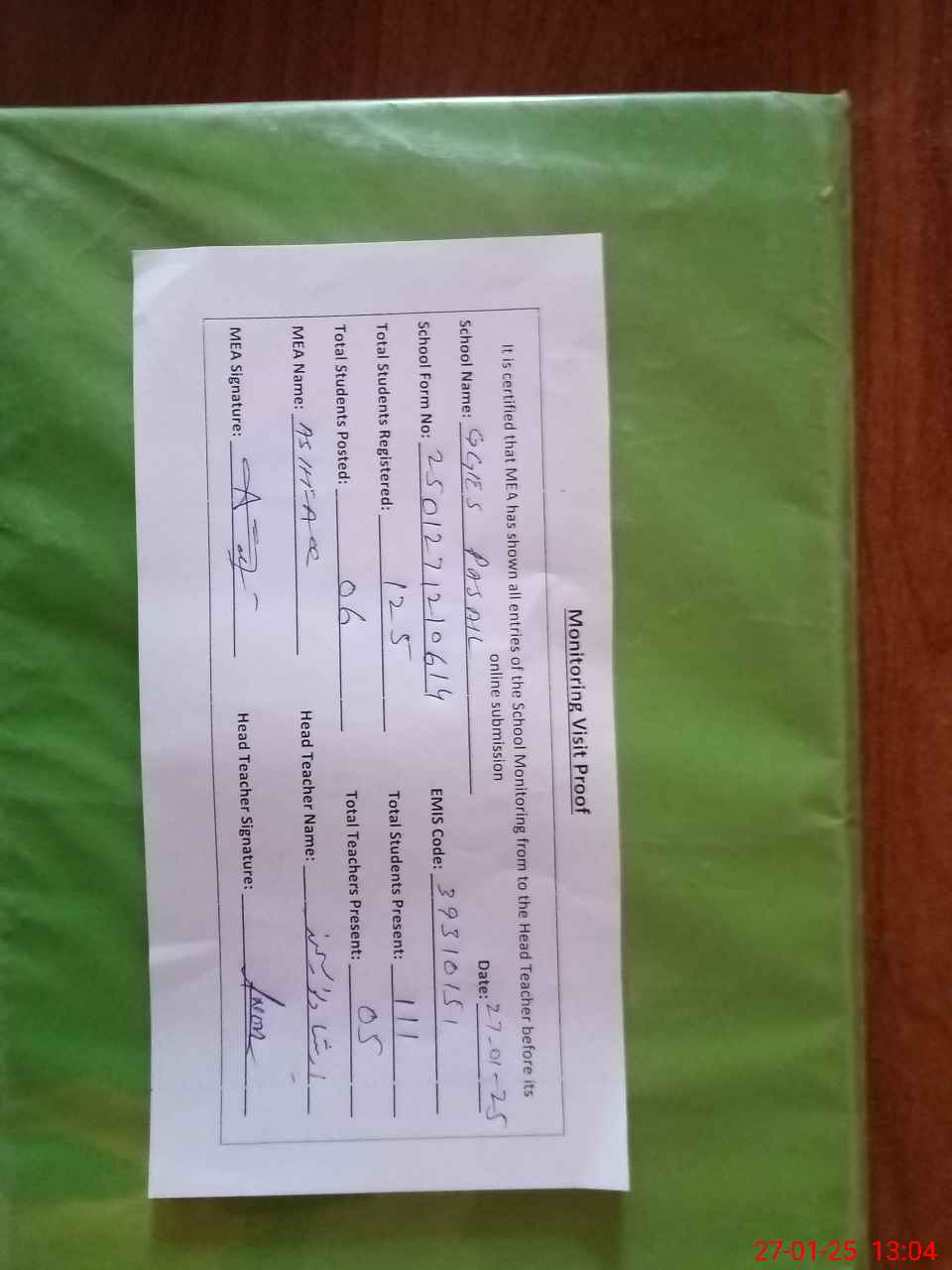 | Attendance Register | Head Teacher | MEA with School | Visit Proof |