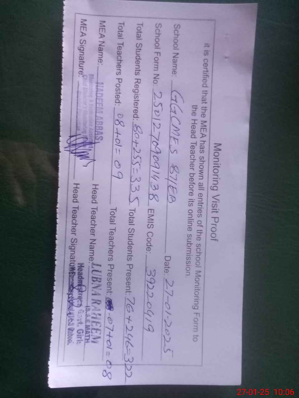| Certified that this School was Inspected by the Undersigned MEA/DMO Today and the Information Stated Above is as Per Record. | |||||