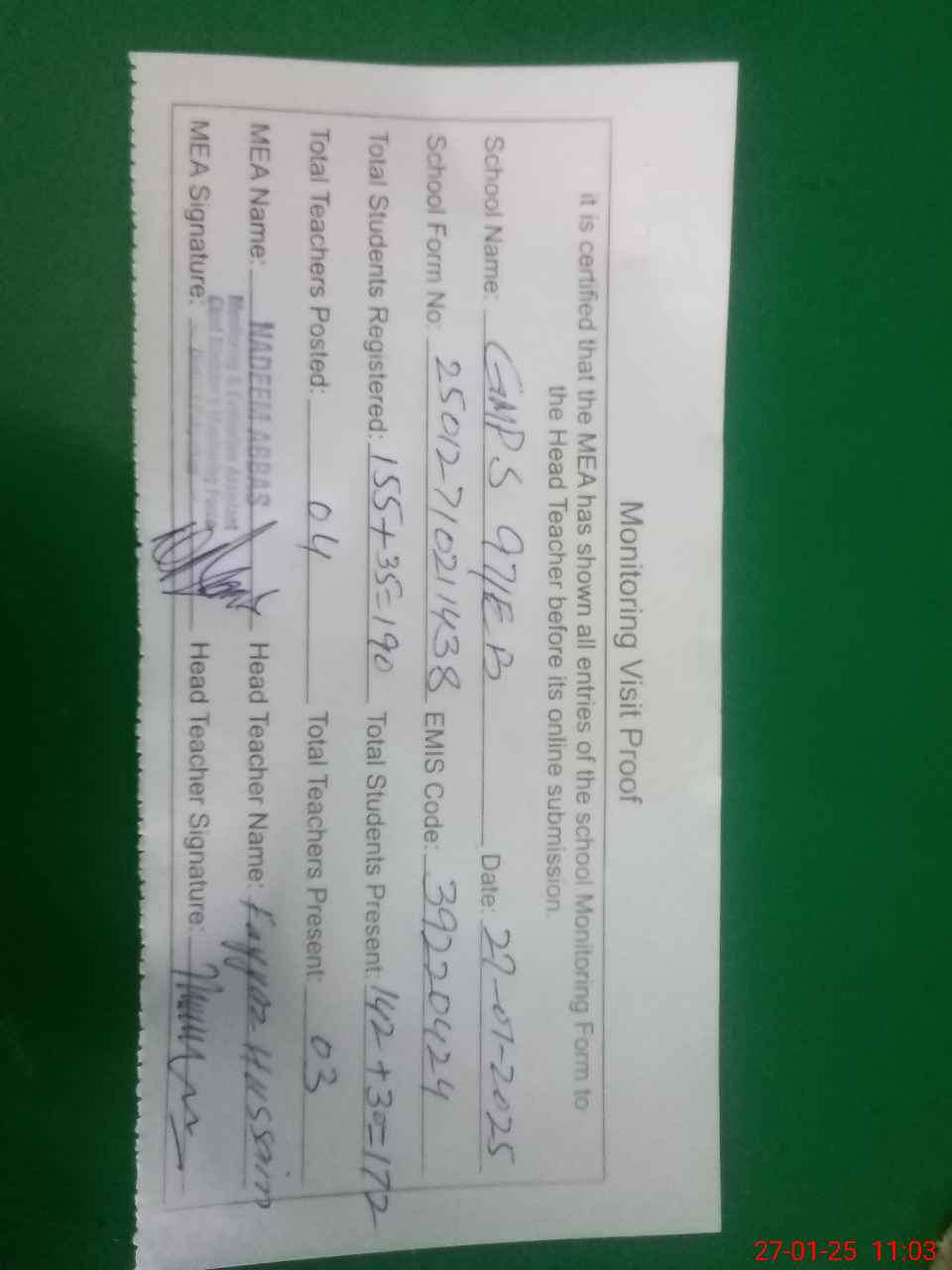 | Attendance Register | Head Teacher | MEA with School | Visit Proof |